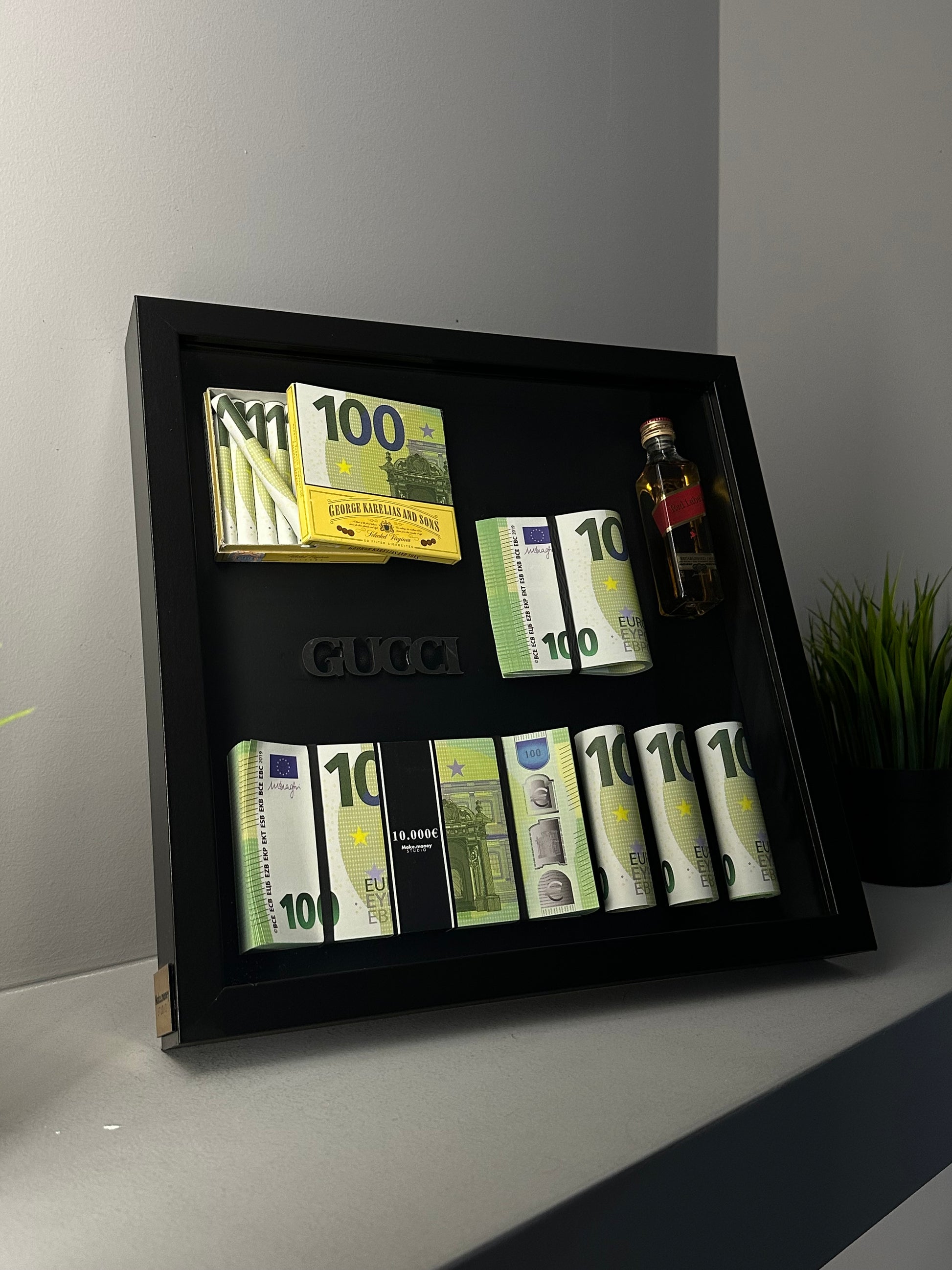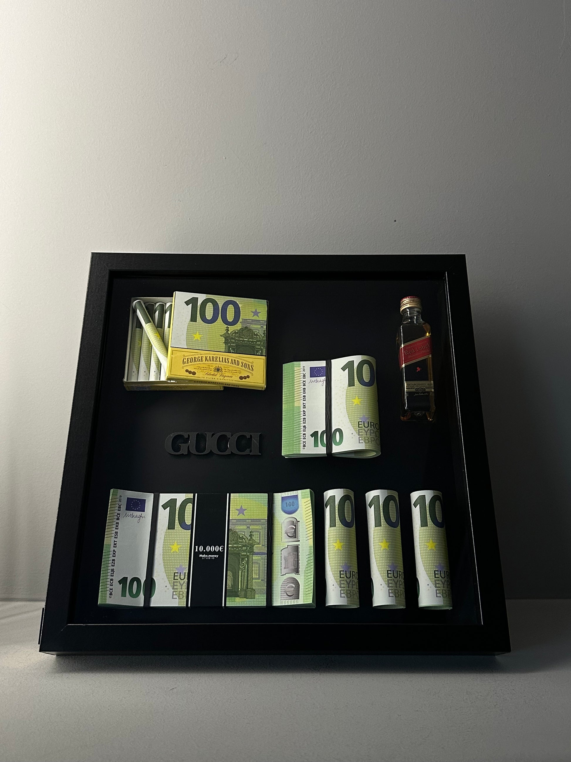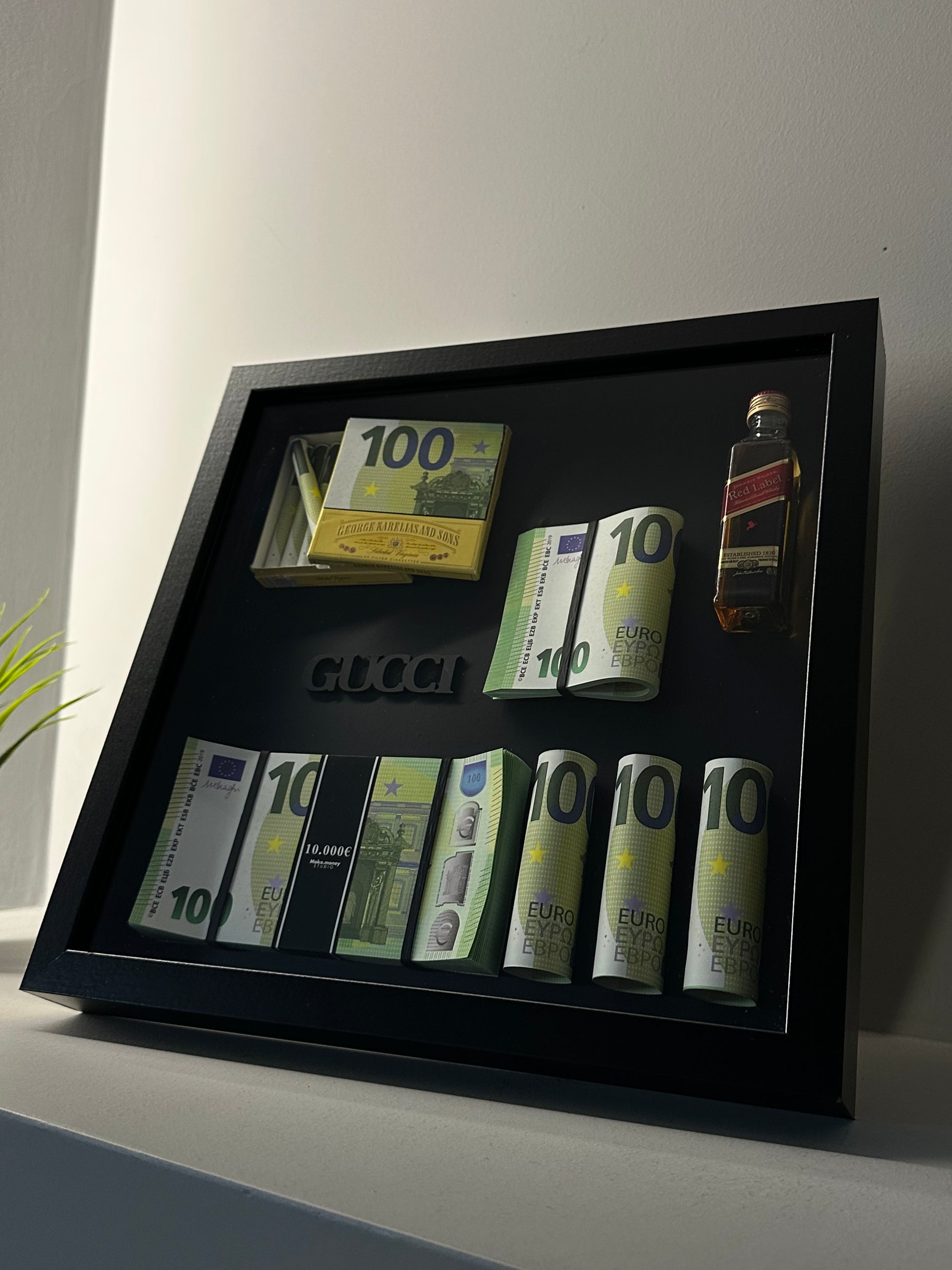 Upgrade your decor with a unique frame that exudes luxury and dynamism. “Gucci & Whiskey” combines money, lifestyle brands and sophisticated style, creating a statement piece that attracts attention.