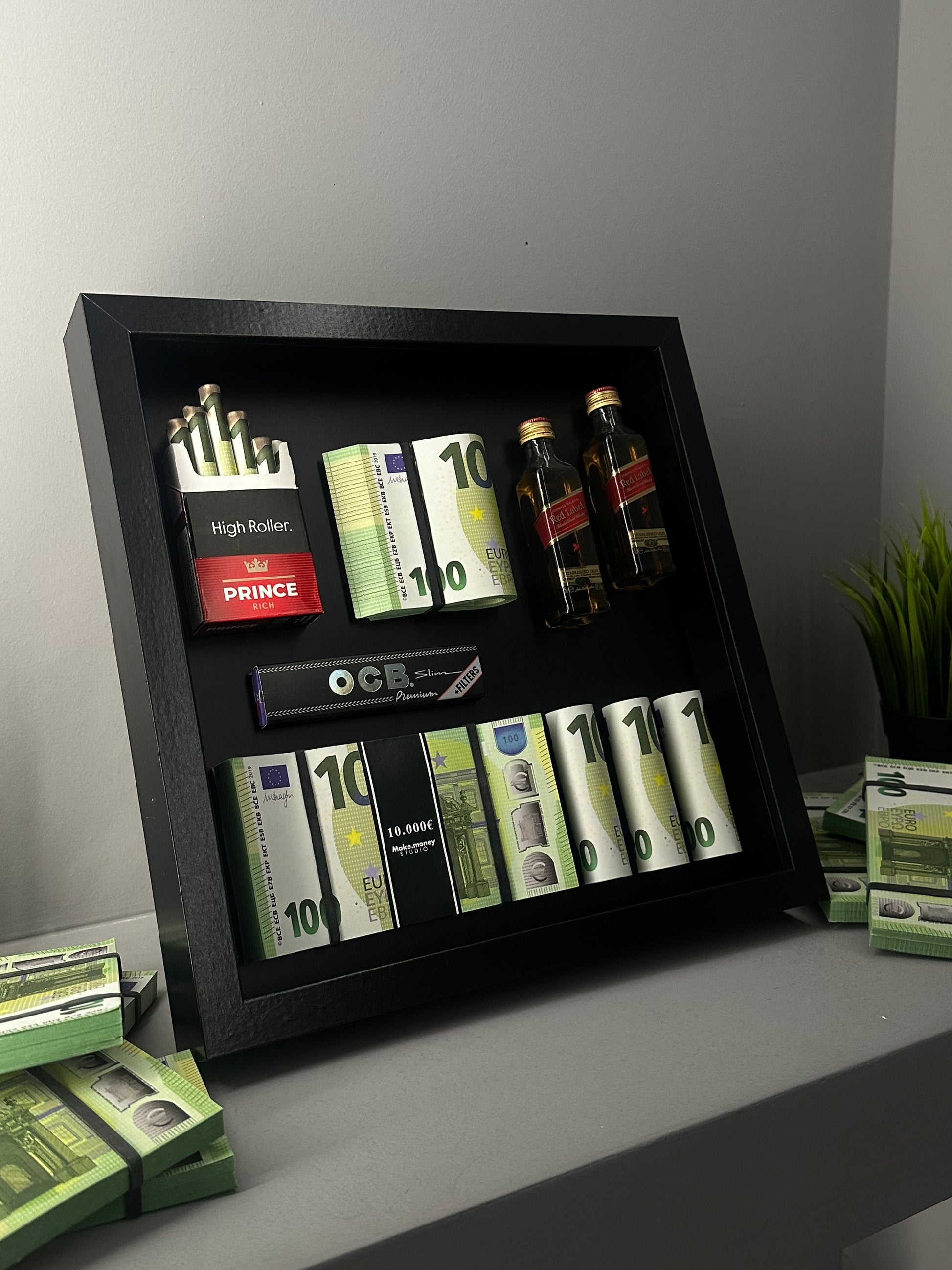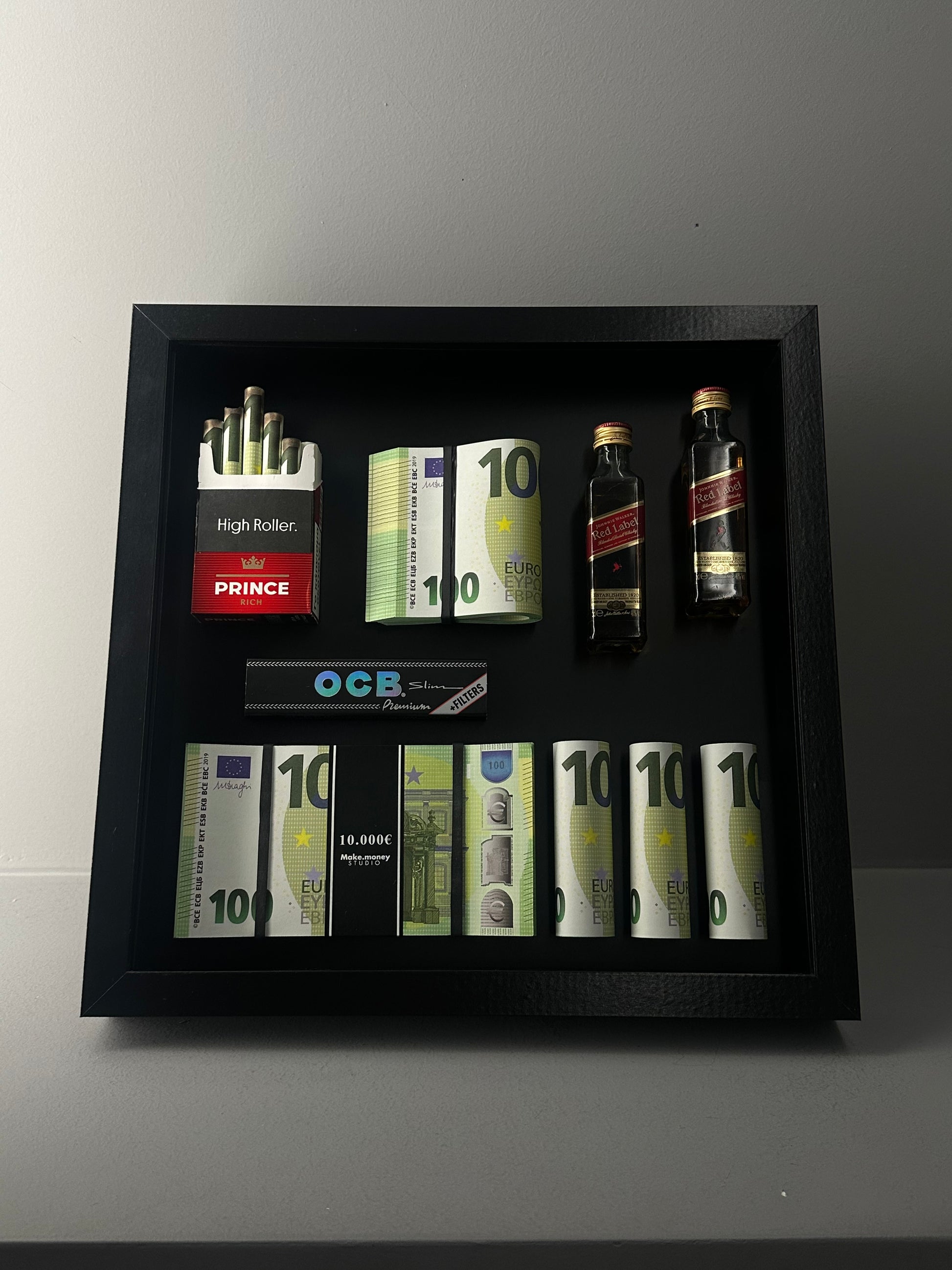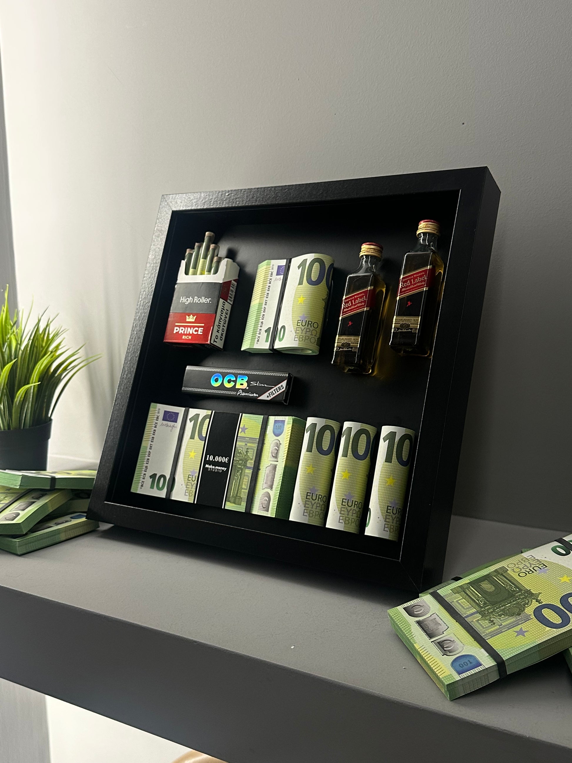 A statement piece for those who love the luxurious lifestyle. This unique handmade frame features wads of money, Jack Daniel's miniatures, OCB papers and a pack of cigarettes, creating an image that exudes style and high-roller vibes. Ideal for spaces with a modern aesthetic, such as offices, game rooms or decorative collections.