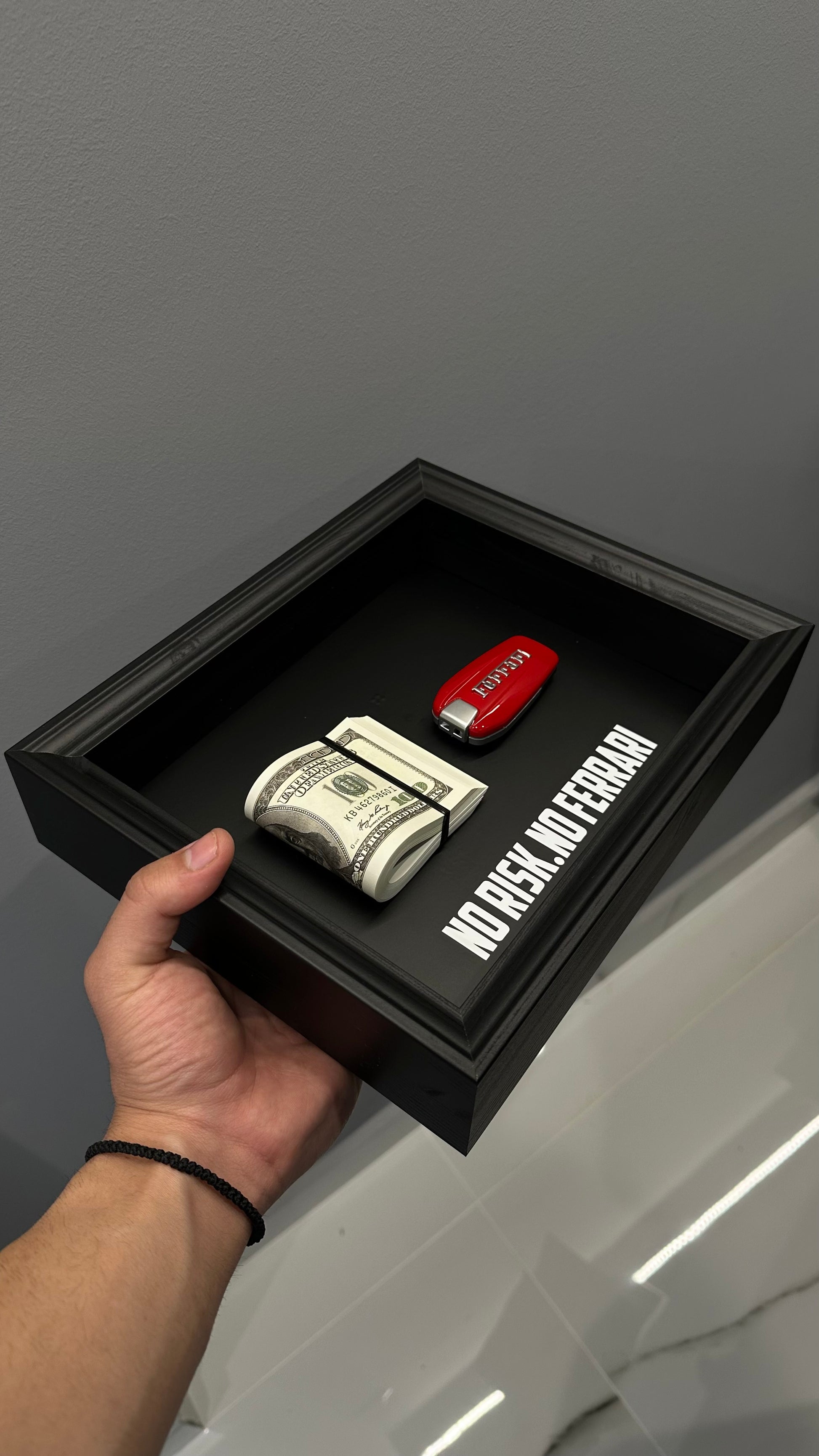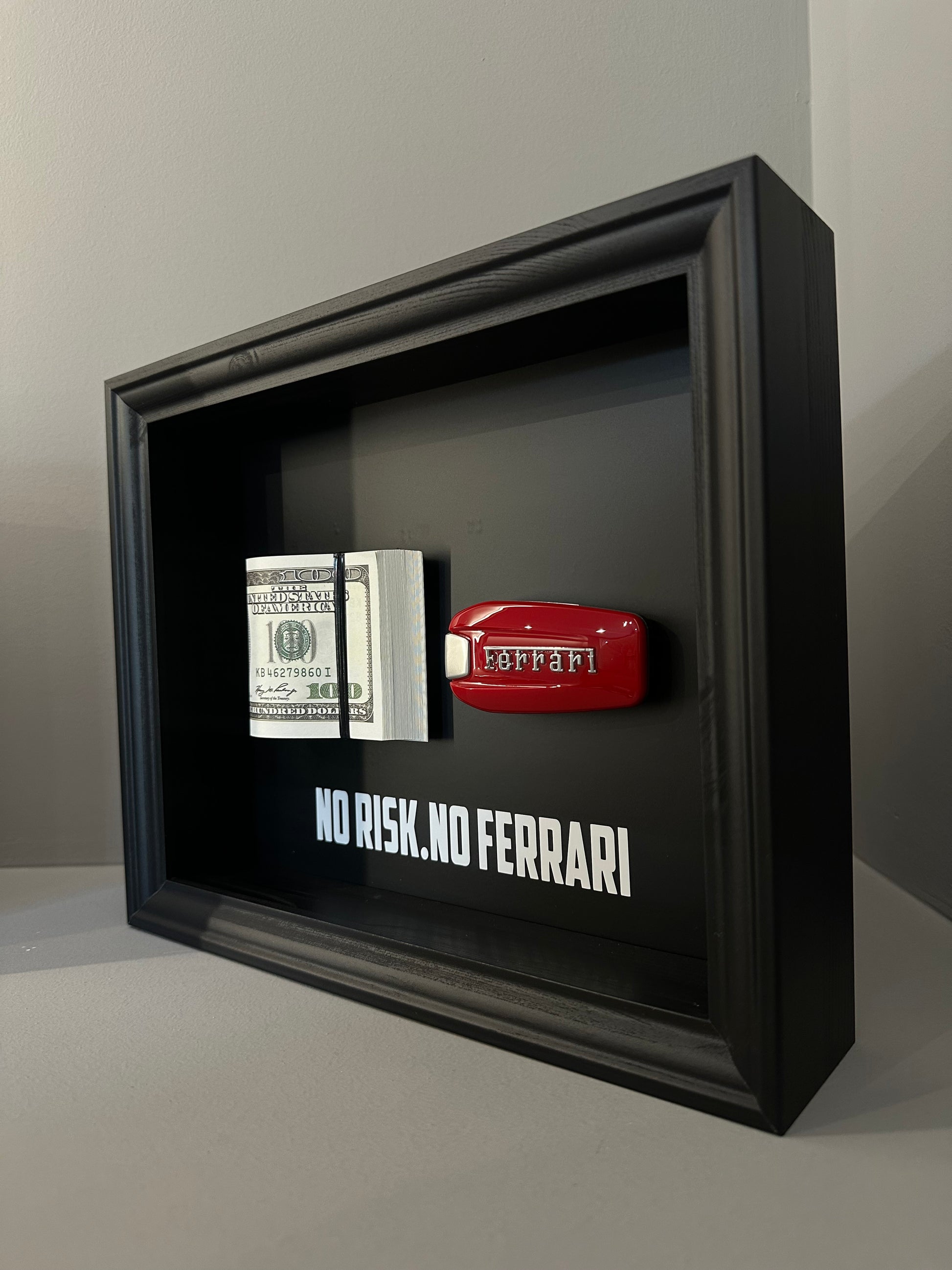 Frame with an authentic Ferrari key and a realistic cash roll.