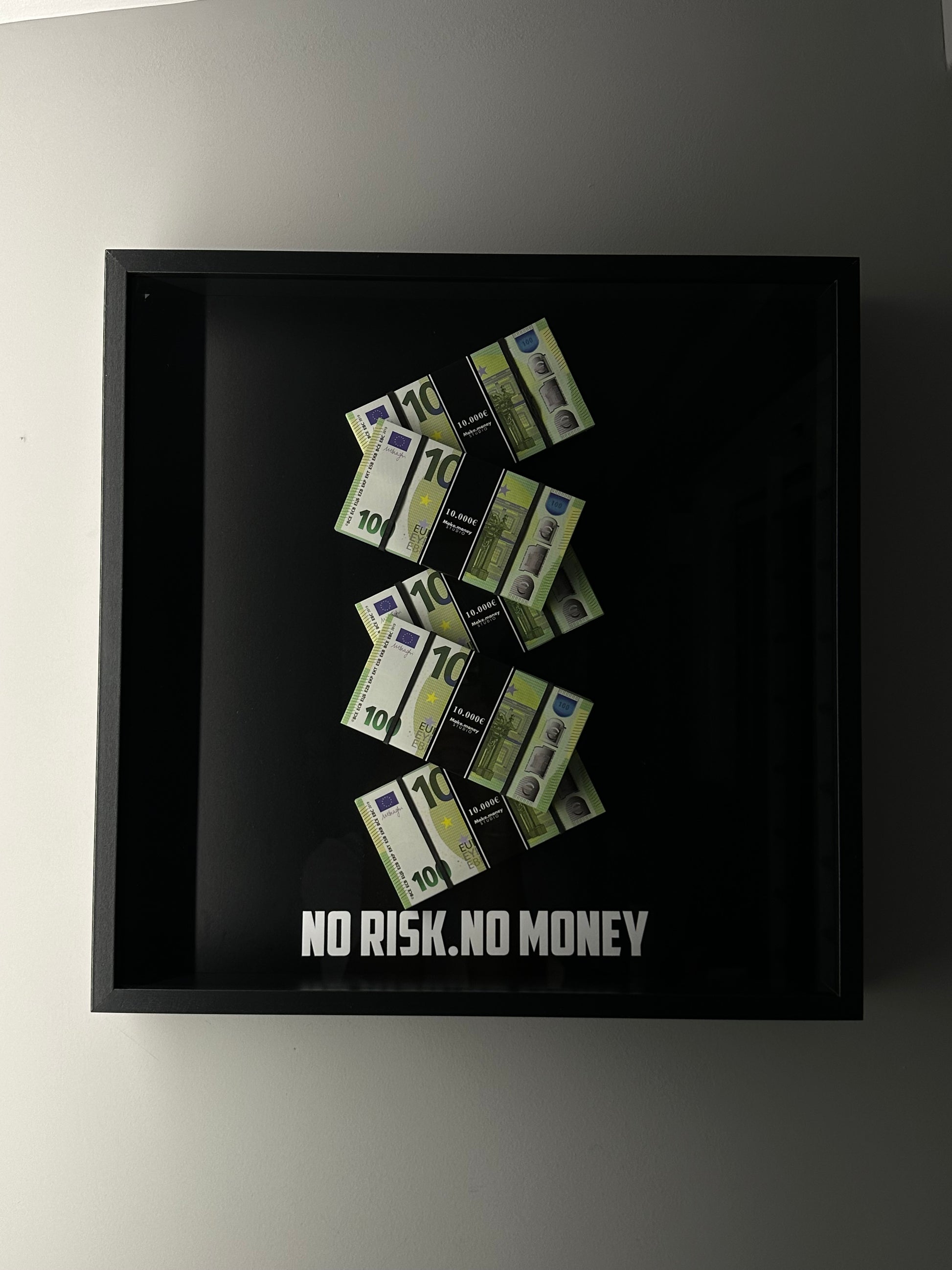Minimal frame with bundles of 100€ in 3D visualization, inspired by the saying No Risk. No Money. Ideal for office, home or workplace, adding a dose of luxury and motivation.
