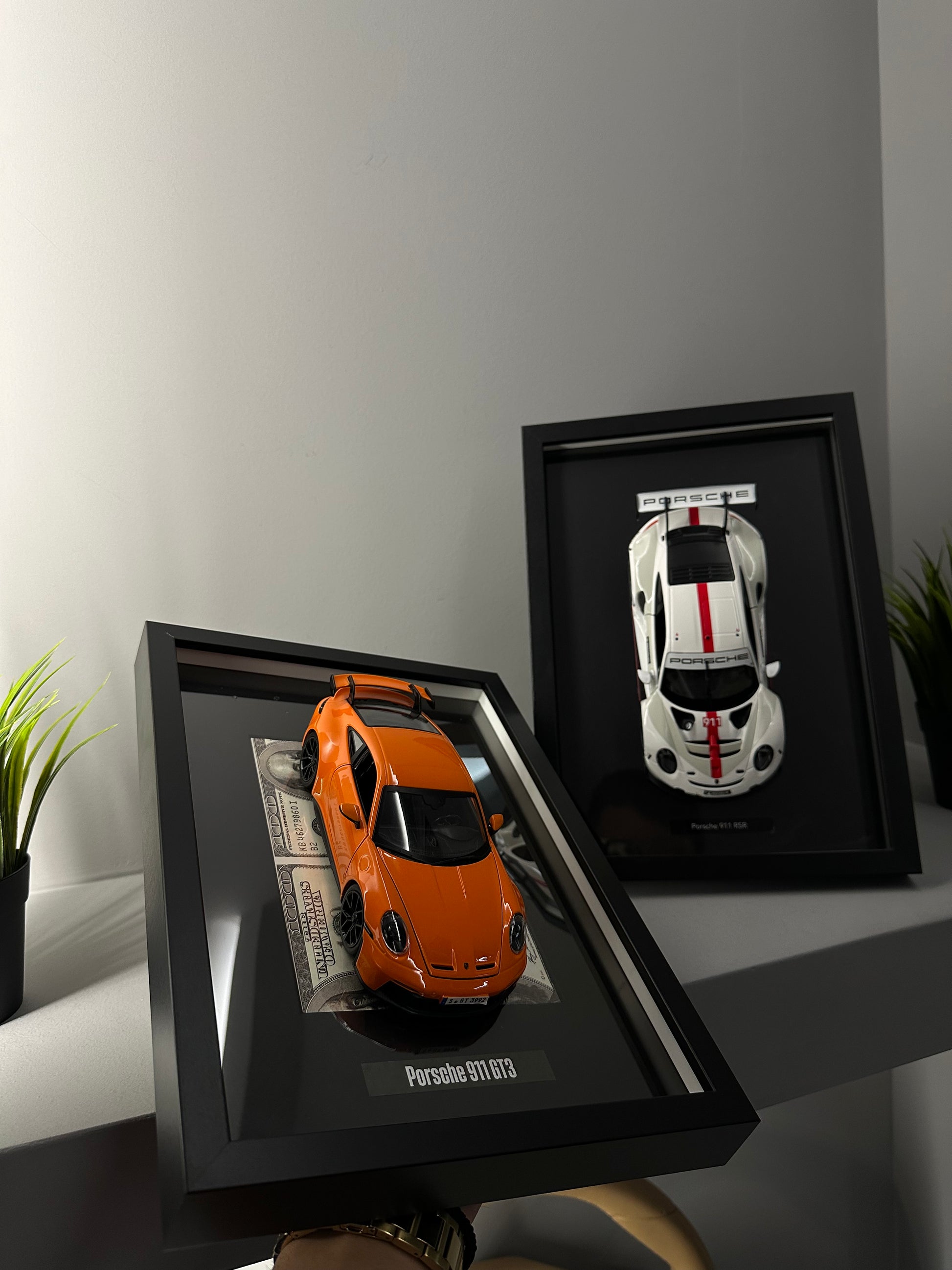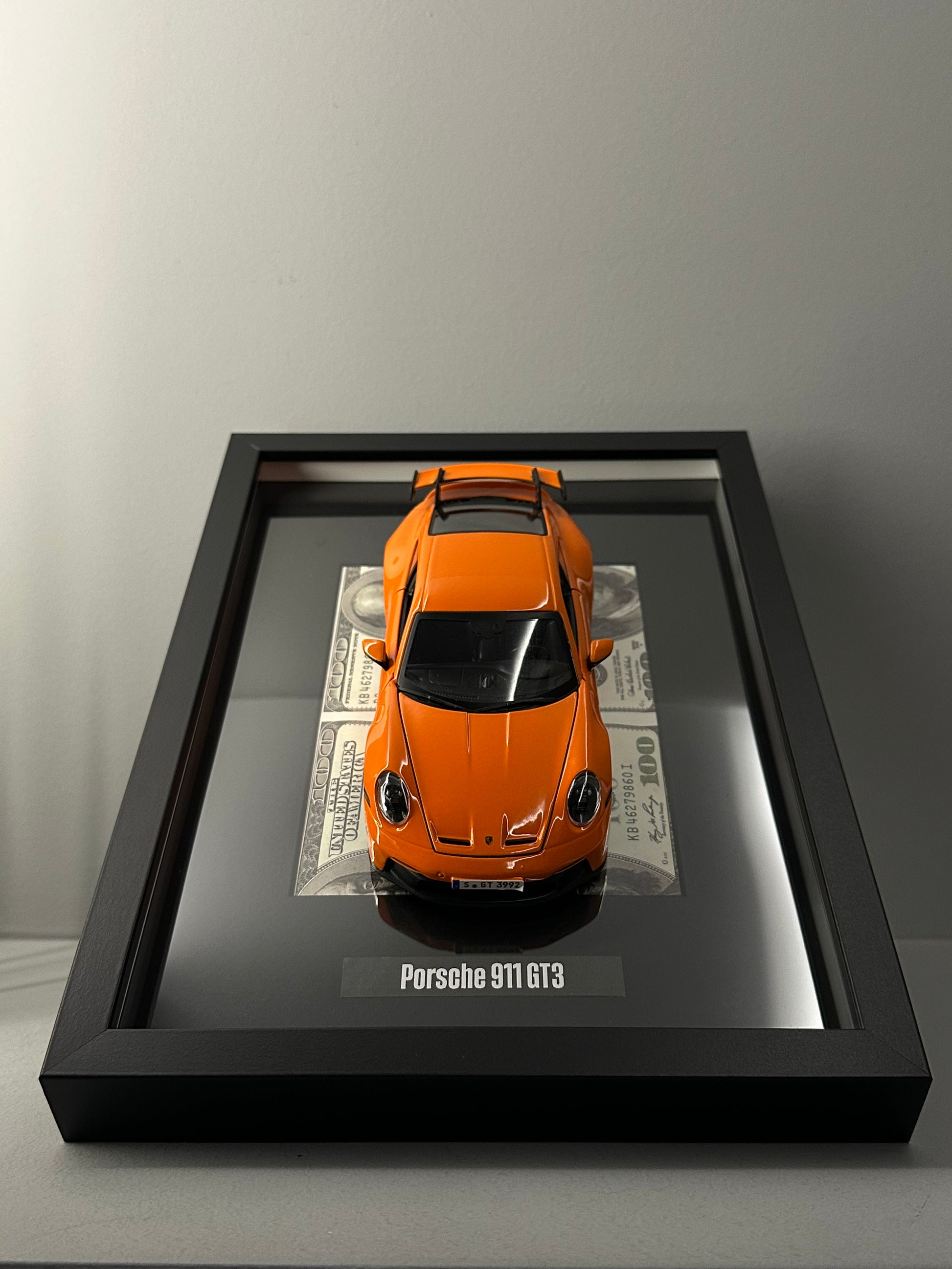 3D frame with the explosive Porsche 911 GT3 in bright red, placed on a background of dollars.
