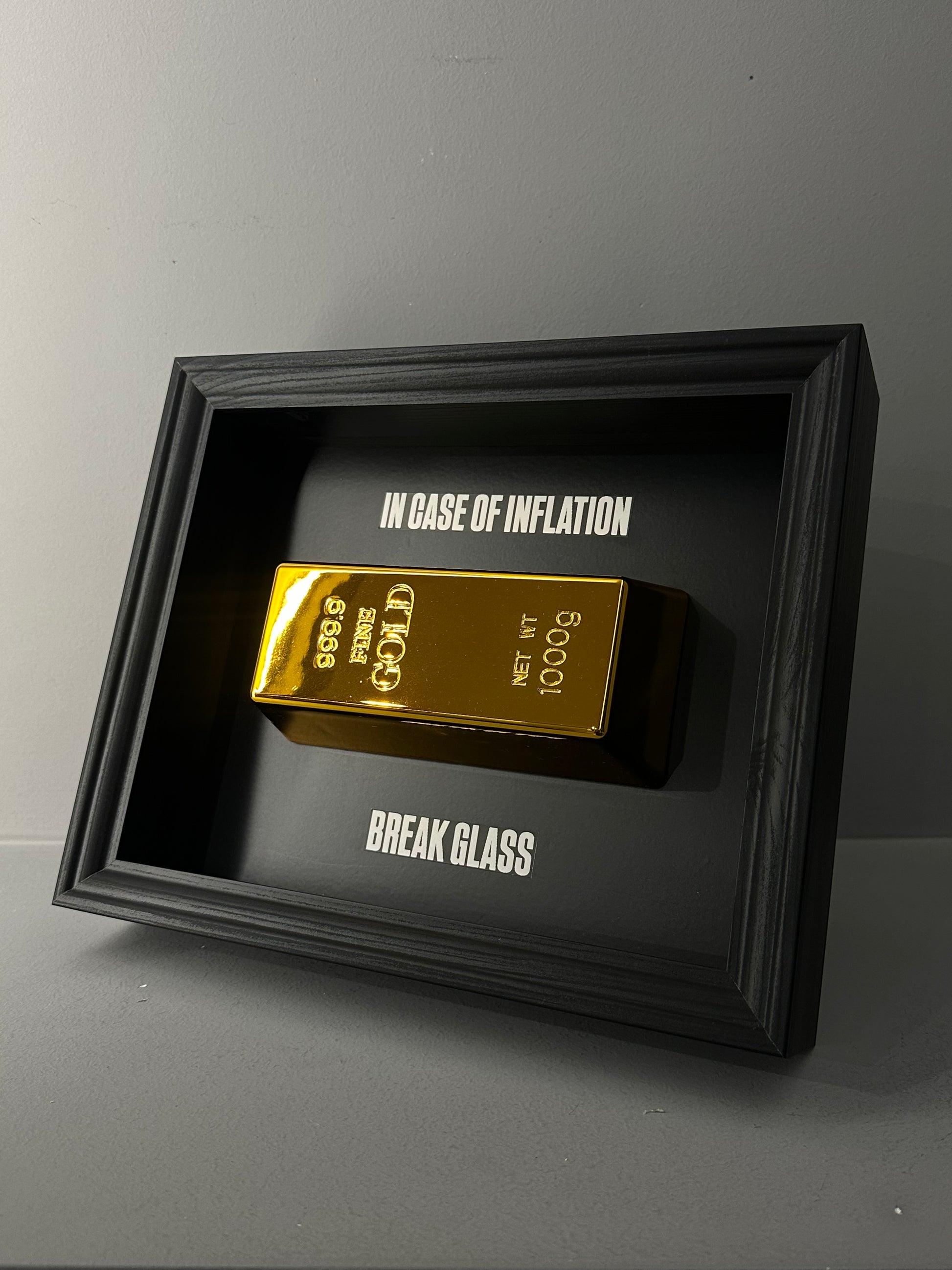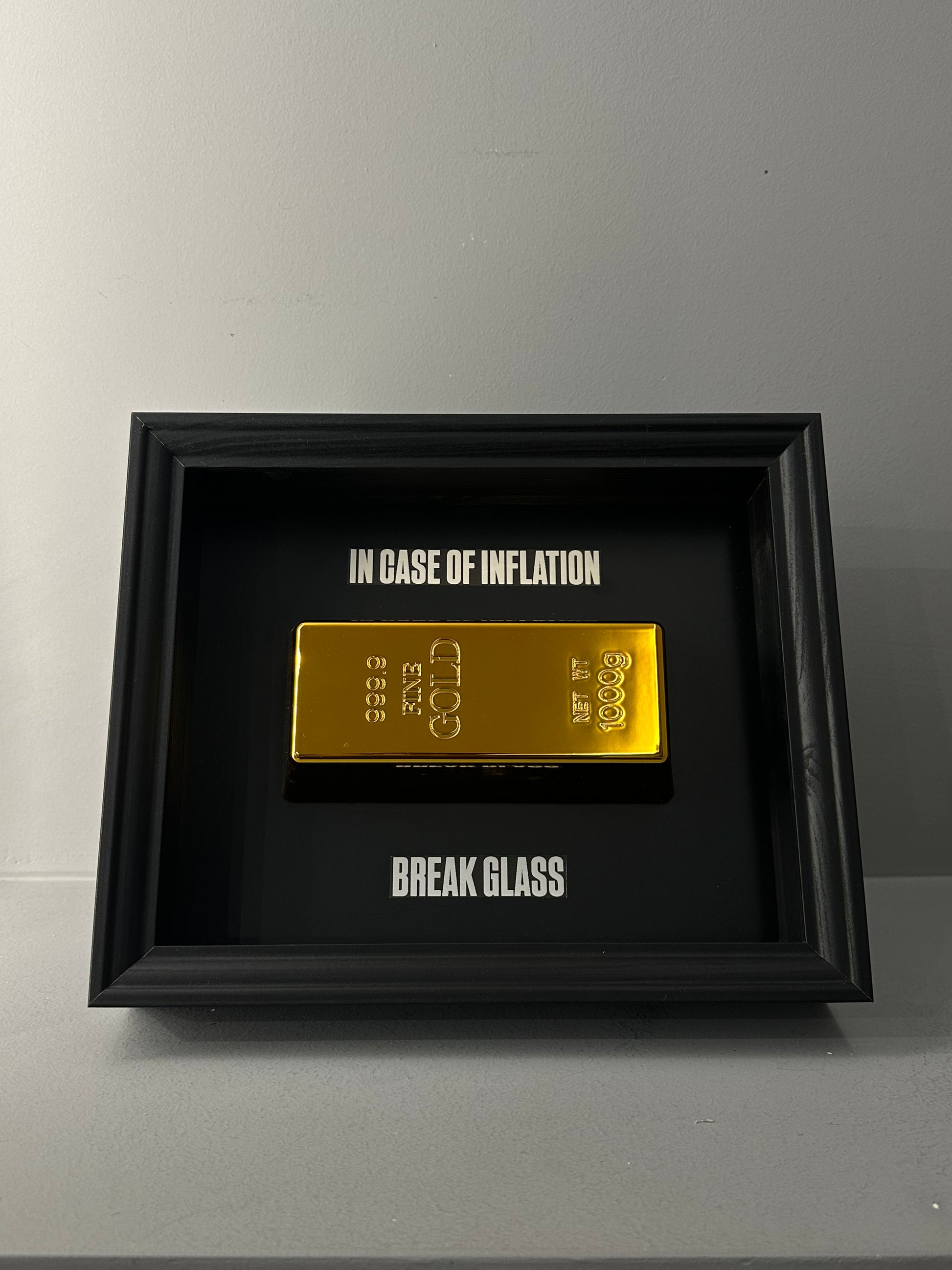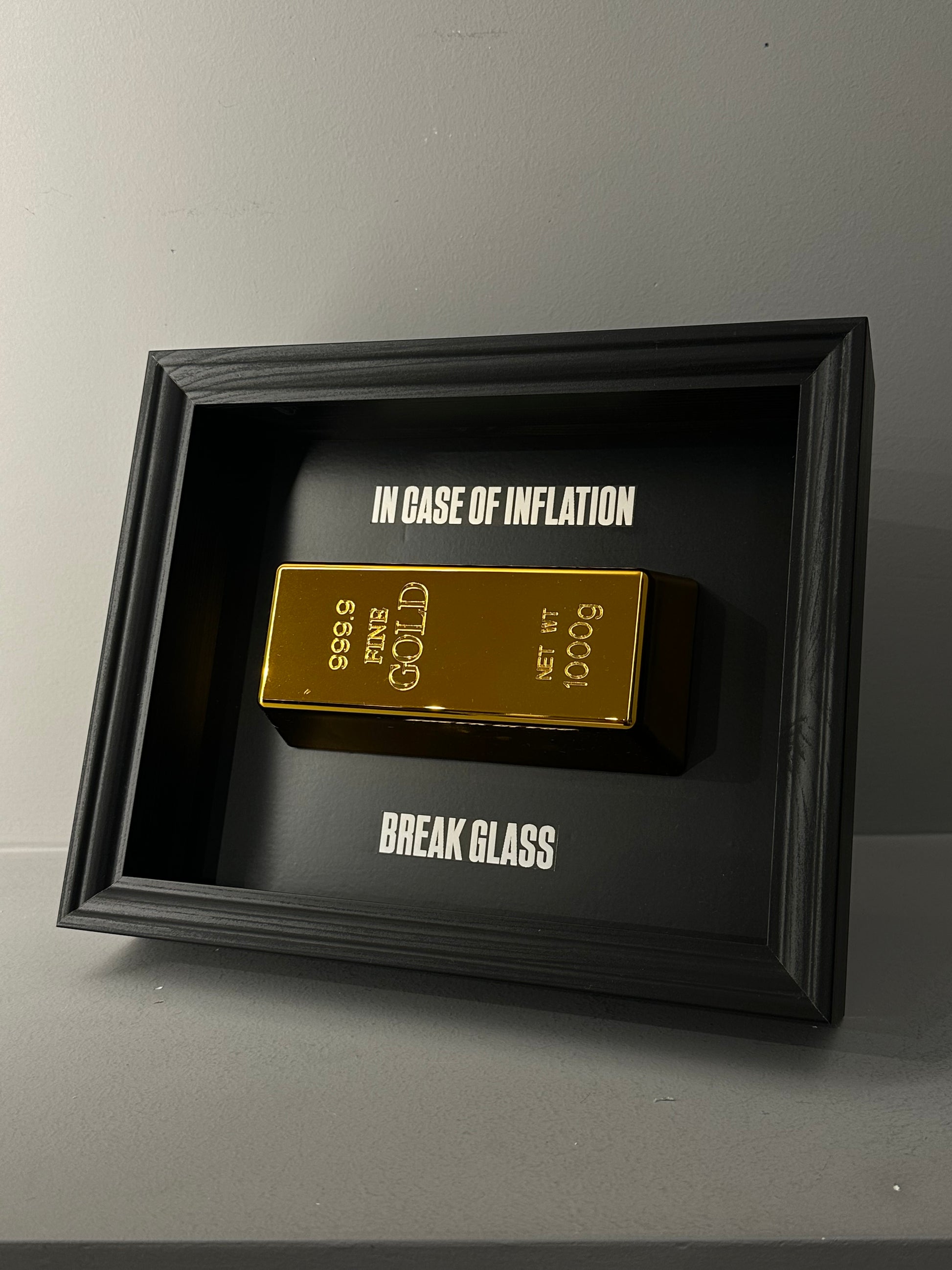 Minimal μαύρο πλαίσιο με διακοσμητική χρυσή ράβδο (Gold Bar) και την επιγραφή “IN CASE OF INFLATION – BREAK GLASS”, σχεδιασμένο για όσους καταλαβαίνουν το real value.